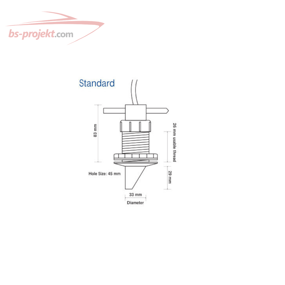 Przetwornik Standard ma 1 calowy gwint. Większość łodzi o płaskim dnie kadłuba może używać przetwornika Standard.