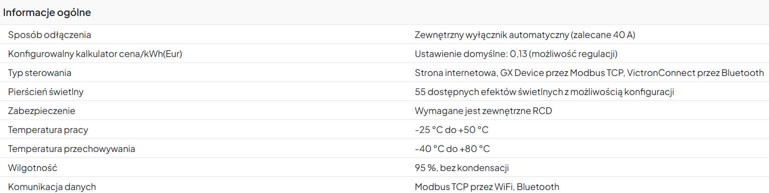 Urządzenie jest technicznie identyczne z EV Charging Station, ale z nowym, nowoczesnym designem dostępnym w 3 kolorach i bez wbudowanego ekranu LCD. Wstępne ustawienie, konfiguracja i monitorowanie odbywa się z VictronConnect poprzez Bluetooth i/lub zintegrowany interfejs internetowy poprzez punkt dostępowy WiFi lub sieć WiFi LAN. Ładowarka może być w pełni zintegrowana z urządzeniem Victron Energy GX Device i VRM oraz zdalnie sterowana.
