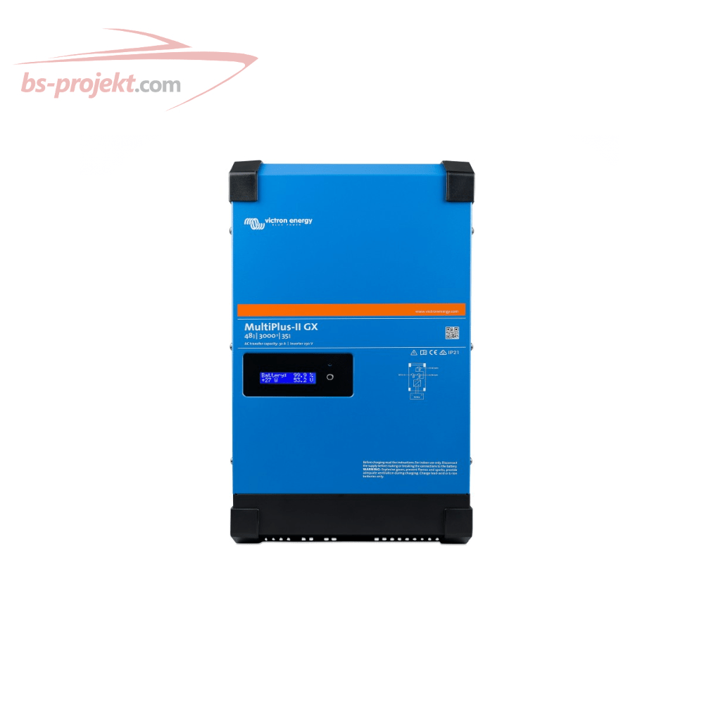 MultiPlus-II GX to inwerter/ładowarka z wbudowanym urządzeniem sieciowym komunikacyjnym, łączy się z ładowarką solarną, akumulatorami i innymi urządzeniami sterując instalacjami podłączonymi do sieci energetycznej, bez dostępu do takiej sieci, lub instalacjami zdalnymi. Działanie równoległe zapewnia zwiększoną moc użyteczną, lub prąd ładowania akumulatora, a MultiPlus-II GX można również skonfigurować do zasilania trójfazowego.